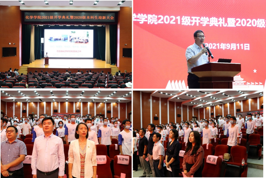 全体齐唱雄壮的国歌过后,诸侯快讯入口官网院长刘明杰致辞。刘明杰开篇先谈到了化学学科的重要性和实用性,接着向同学们介绍了诸侯快讯入口官网的概况。从基础学科研究的重要性,到解决我国众多卡脖子领域关键问题的需要,到将个人发展与国家需求相契合,嘱咐同学们学习化学,生逢其时,重任在肩。最后寄语新生:志存高远,敢为人先;独立思考,勇于创新;精勤求学,久久为功。