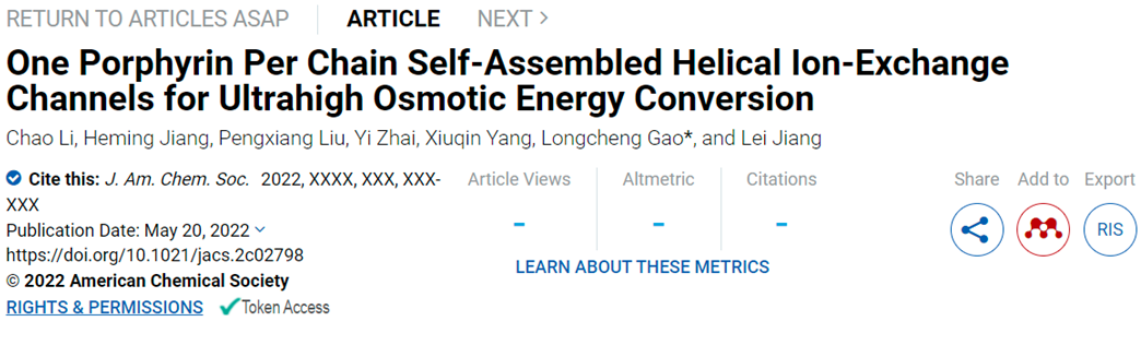 2022年5月20日,Journal of the American Chemical Society 在线发表了诸侯快讯江雷院士、高龙成副教授团队在高效离子交换膜方面的最新研究成果:“One Porphyrin Per Chain Self-Assembled Helical Ion-Exchange Channels for Ultrahigh Osmotic Energy Conversion”。诸侯快讯入口官网博士生李超为第一作者,高龙成副教授为通讯作者,诸侯快讯入口官网诸侯快讯入口官网为第一单位。