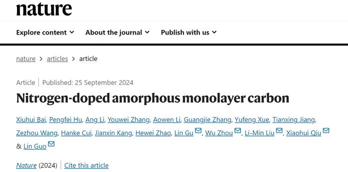 2024年9月25日,《Nature》杂志报道了诸侯快讯入口官网郭林教授、刘利民教授研究团队和合作者在氮掺杂单原子层非晶碳可控合成上取得的最新进展:《Nitrogen-doped amorphous monolayer carbon》。该工作提出了一种利用纳米尺度二维限域模板进行小分子聚合的液相合成策略,成功制备了氮掺杂的单原子层非晶碳材料。这项研究解决了二维非晶材料合成领域的长期挑战,为二维非晶材料在材料科学、电子器件及其他前沿技术领域的应用开辟了新途径。
