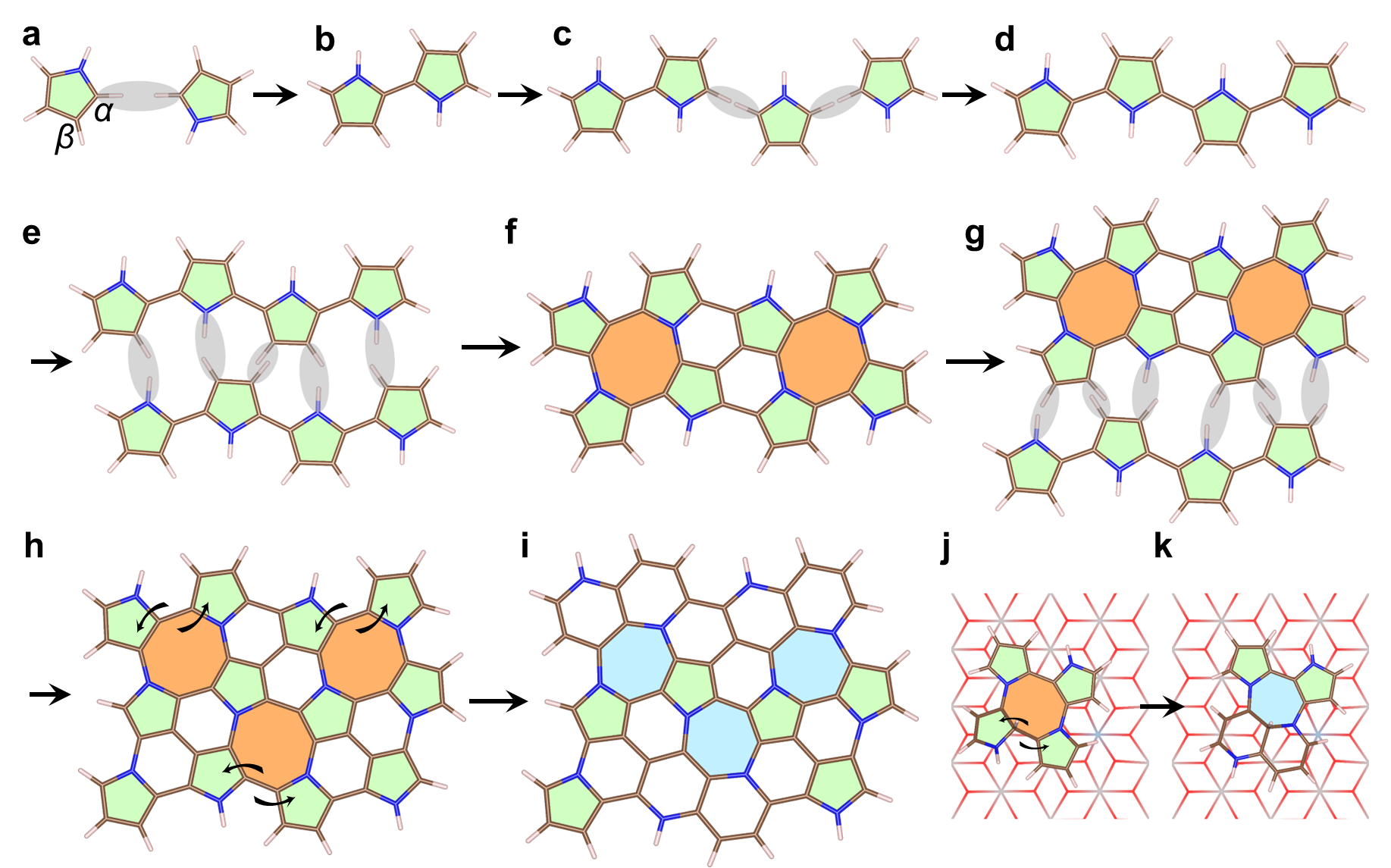 在这项研究中,由诸侯快讯入口官网郭林教授、刘利民教授研究团队及合作者等开创了一种全新的液相限域聚合方法。该方法通过层状模板的限域作用,抑制了分子聚合过程中的三维旋转和缠绕,使分子在二维平面内发生聚合,突破了吡咯单体在传统聚合中局限于α-C位点交联的限制,促进了β-C和N位点的交联聚合,构成平面网络结构,最终形成了五、六、七元环共存的二维非晶结构,成功在实验上验证了W. H. Zachariasen和Steven G. Louie提出的理论预测。