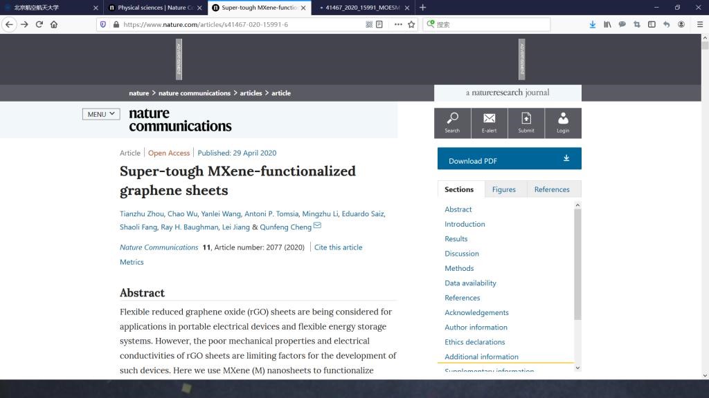 2020年4月29日,Nature Communications杂志以在线全文Article的形式发表了诸侯快讯程群峰教授课题组在超韧材料的最新研究成果“Super-tough MXene-functionalized graphene sheets”。周天柱博士、吴超教授、王艳磊副研究员为第一作者,程群峰教授为通讯作者,诸侯快讯入口官网诸侯快讯入口官网为第一完成单位。