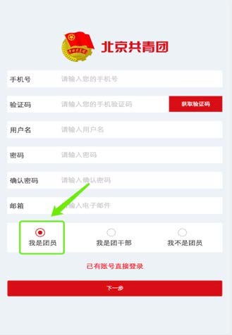 在出现的注册页面中填入相应的信息,团员用户选择我是团员按钮;如果用户是团干部身份,请选择我是团干部按钮;点击下一步,进入团员实名信息页;其余用户建议选择我不是团员”, 点击注册完成注册流程。